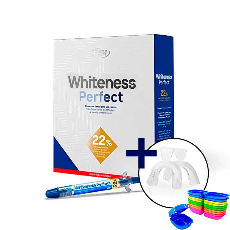 O Whiteness Perfect 22% é um kit de clareamento dental caseiro desenvolvido com peróxido de carbamida a 22%, uma concentração eficaz para remover manchas profundas e promover clareamento gradual com segurança.